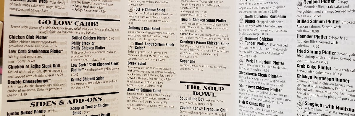 The menu offers a delightful range of options for every meal, from comforting Soup of the Day ($5.59) to the hearty Captain Ken's Firehouse Chili ($7.39), perfect for those craving warmth. Breakfast enthusiasts will adore the fluffy pancakes, available in various quantities, starting at just $3.69.